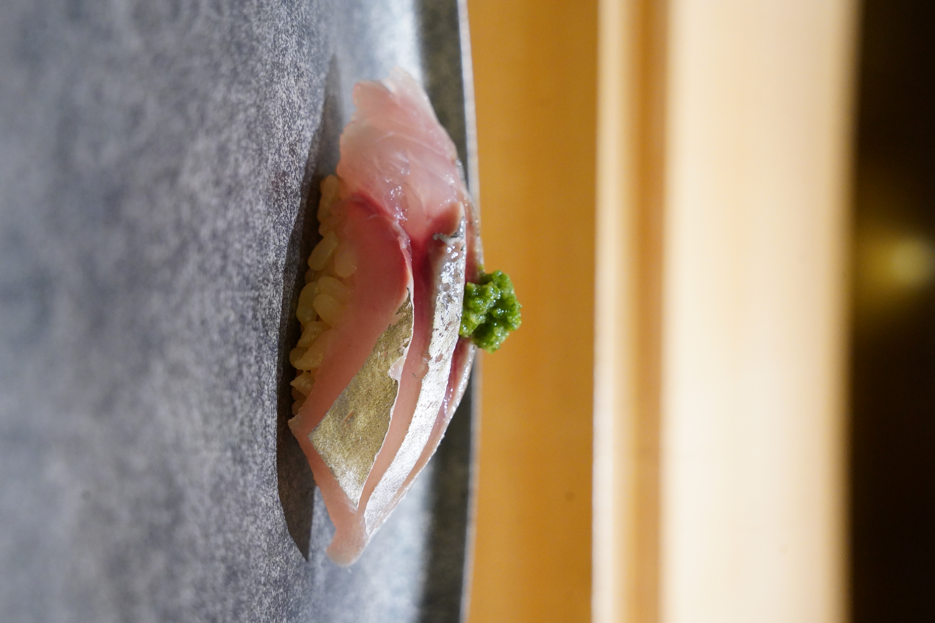 三重から取り寄せた六メートルの檜カウンターが上質な存在感を放ち、木の温もりと香りが店内を包みます。落ち着いた照明と静かな空気感の中で、心ゆくまで鮨を堪能できる安らぎの空間です。