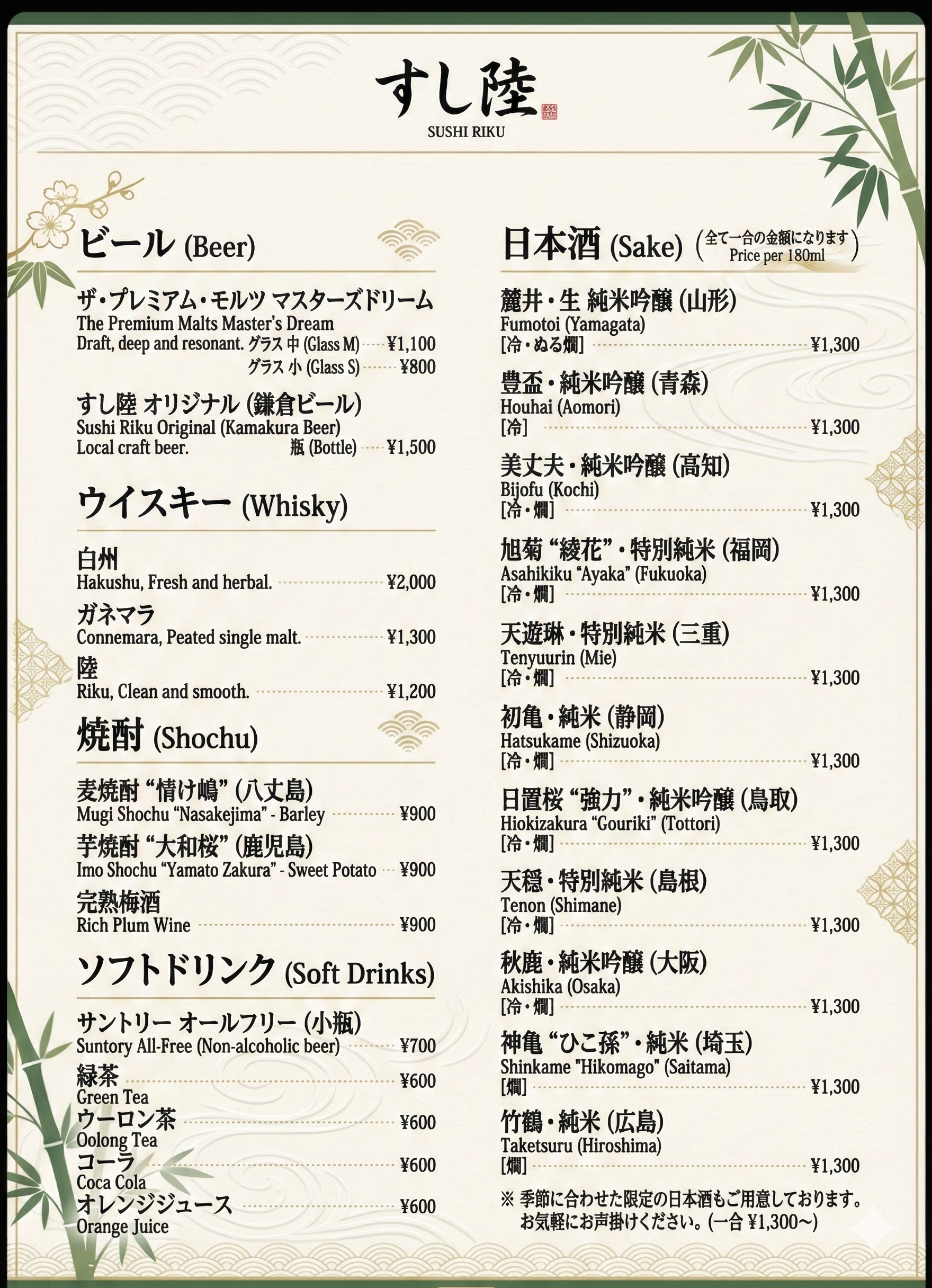 「すし 陸」では、季節ごとに最も輝く旬の素材を厳選し、熟練の技をもって一貫に昇華させます。旨味を引き出す精緻な仕込み、温度・食感・香りの調和、握りのわずかな力加減、すべてが研ぎ澄まされ、生み出される鮨は一瞬の儚さと深い余韻を併せ持ちます。 五感を満たし、心を静かに震わせる、記憶に残る鮨体験をぜひご堪能ください。