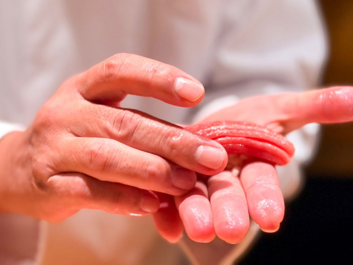 滑らかな木肌、清らかな香り、端正な佇まい、そのすべてが非日常へと誘います。照明や陰影、質感まで細部に配した美意識が、職人の所作をいっそう際立たせ、静寂すらご馳走となる空間をつくり上げます。都会の中心とは思えない、深い安らぎをご体感ください。
