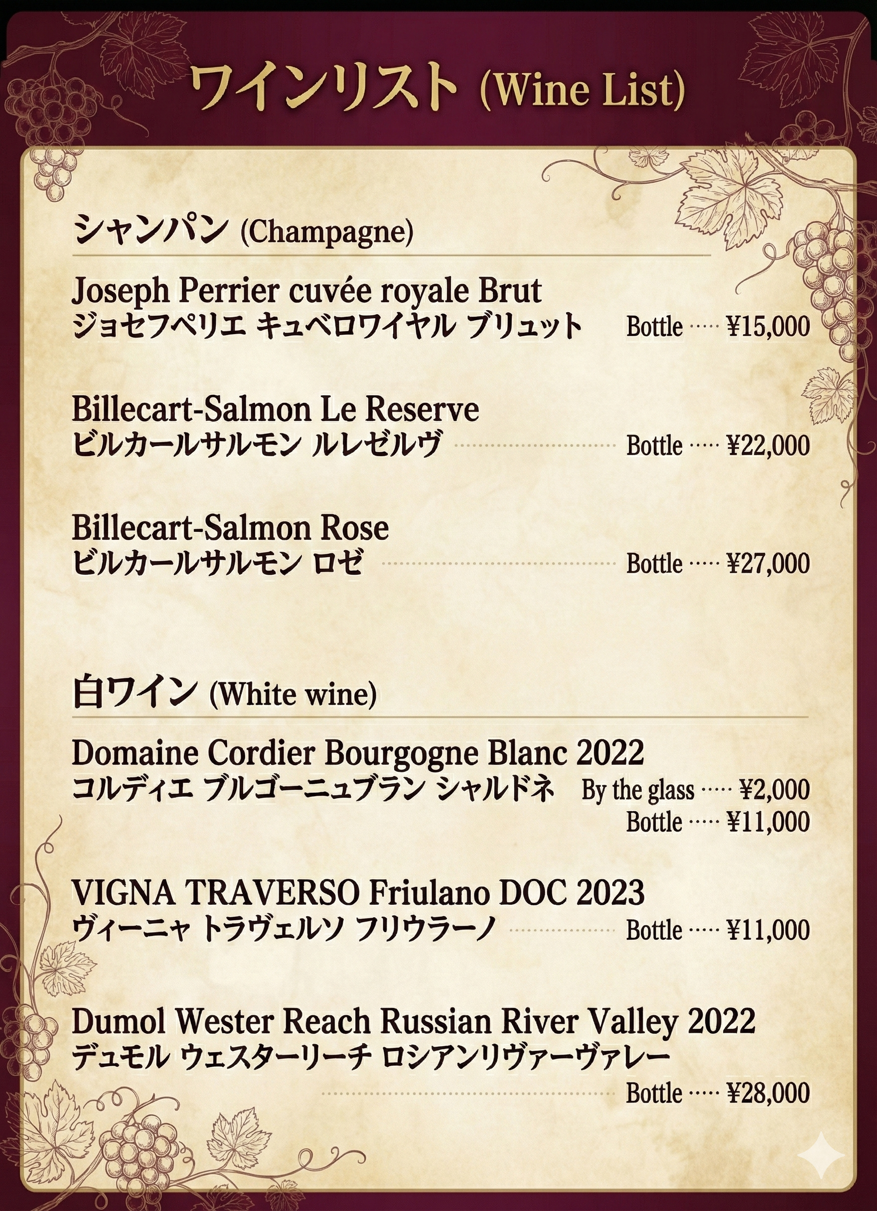 ・ご予約のお時間通りにお越し下さいませ。お時間が過ぎますと、お席をご案内できない場合がございます。